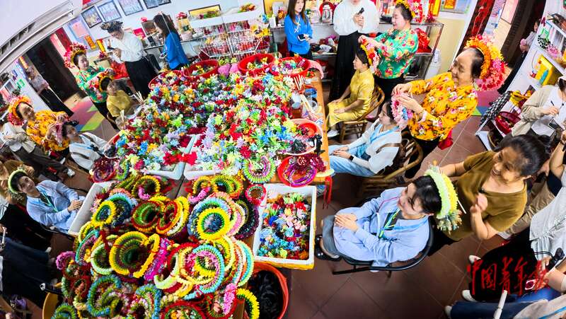 8月18日,福建省泉州市蟳埔民俗文化村,一家簪花店内,当地蟳埔女为游客做“簪花围”。中青报·中青网见习记者 陈思阳/摄