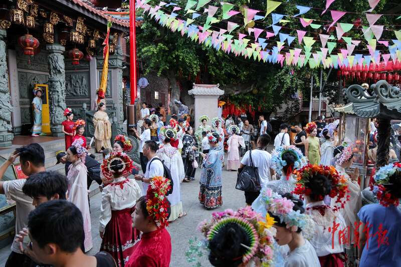 8月18日,福建省泉州市蟳埔民俗文化村,“簪花围”的爆火带动了当地文旅的发展,来自五湖四海的游客汇聚于此。中青报·中青网见习记者 陈思阳/摄