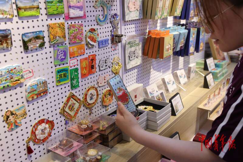 7月29日,内蒙古包头市“天下黄河第一村”,在黄河文创商品店内,游客正在挑选冰箱贴等文创商品。中青报·中青网见习记者 陈思阳/摄