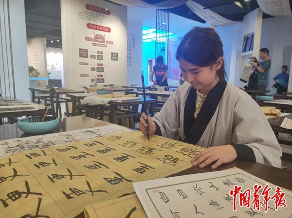 莎车县位于新疆西南边陲,是古丝绸之路上的重镇。中青报·中青网记者来到坐落于莎车县新时代文明实践中心的浦莎书院时,9岁的维吾尔族小姑娘玛依热刚从暑期的书法课下课,意犹未尽的她还在用毛笔临帖。“学久了之后就不难学了,每周除了周六周日,剩下5天我都来上课。”她说。