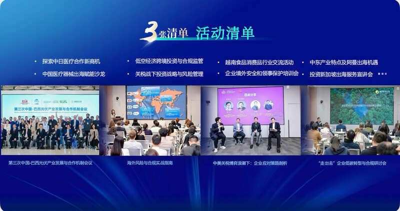 第三张是活动清单。为了让企业有更多的“出海”机会,虹桥海外发展服务中心每年都会举办各种各样的活动,中国医疗器械出海赋能沙龙、越南食品消费品行业交流活动、中东产业特点及阿曼出海机遇……这些活动让企业寻找“商机”,也为企业“出海”赋能。