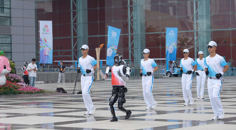 全球首款5G-A人形机器人“夸父”亮相十五运会火炬传递。受访者供图