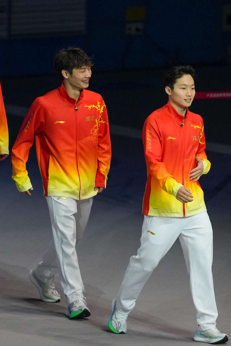 11月3日,湖北队组合王宗源(右)/郑九源在全运会跳水男团三米板双人比赛前入场。赛事组委会供图