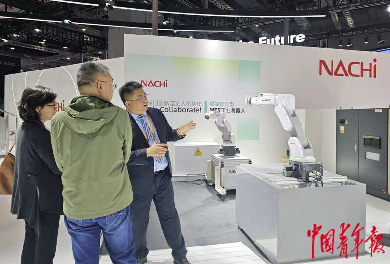 第八届进博会开幕第二天,不二越(中国)有限公司营业企划部门总监杨宇航不止一次模拟展示人与碰撞预判型工业机器人的“相处”:当人靠近时,碰撞预判型工业机器人“皮肤”里有传感器会测量距离,动作会自动放缓,当走远时,动作将继续恢复。