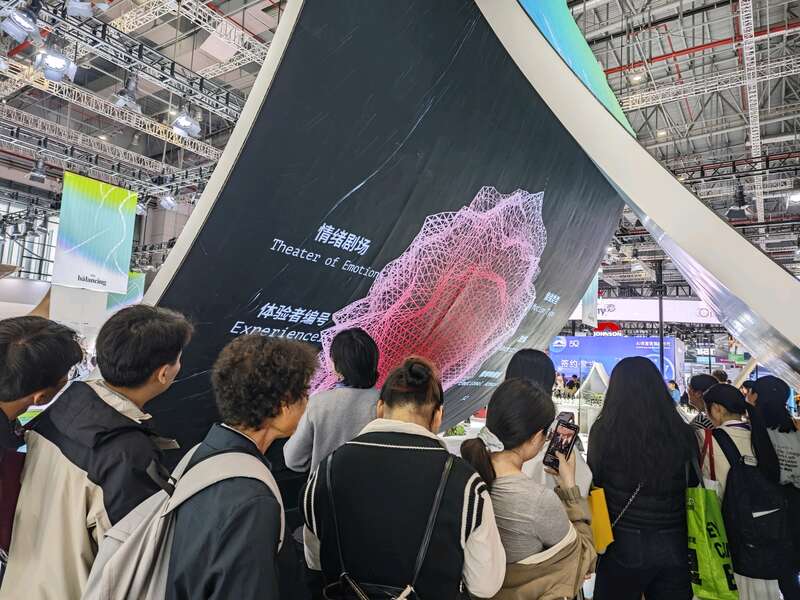 在消费品展区百联the bálancing展台,一款艺术互动装置吸引观众体验情绪值变化。展台工作人员介绍,该装置通过AI情绪识别、实时数据交互与场景化算法,实时捕捉观众生理信号,将无形情绪转化为动态视觉场景,并基于生成的情绪场景,进行穿搭个性化推荐。
