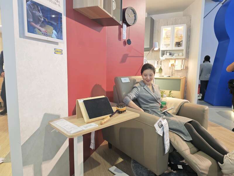 在日常起居场景,宜家展台放置全新升级的RULLERUM鲁勒鲁姆电动沙发。2022年进博会,这款沙发于中国首发,并获得持续的销量增长,“它在2025财年是宜家沙发品类中的销量第一。”彭博介绍,今年升级后,该款沙发能实现110度到140度的角度倾斜且只有伸、缩两个按钮,适合老年人操作。