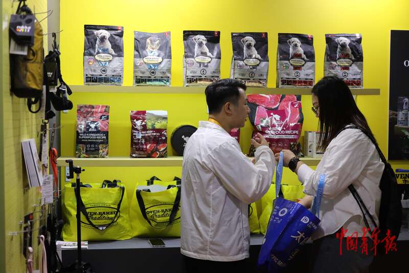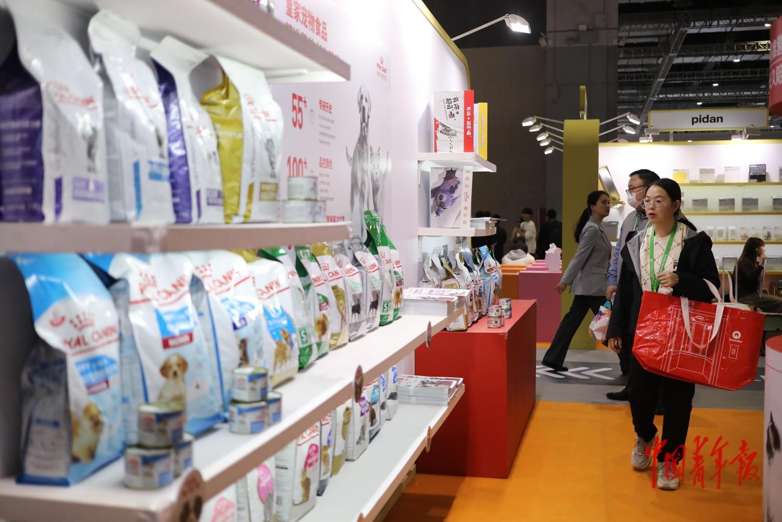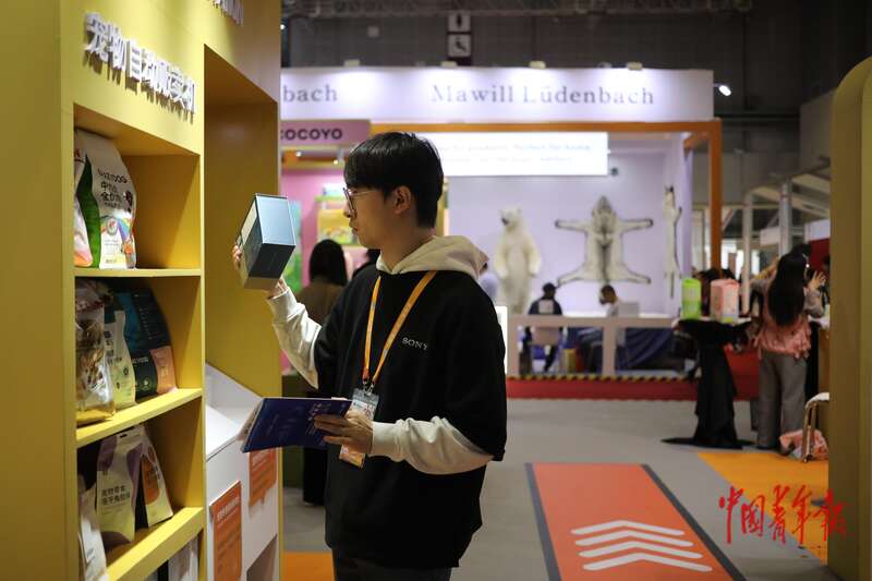 11月8日,上海国家会展中心,第八届中国国际进口博览会消费品展区,一名参观者在选购狗粮。中青报·中青网记者 孔斯琪/摄