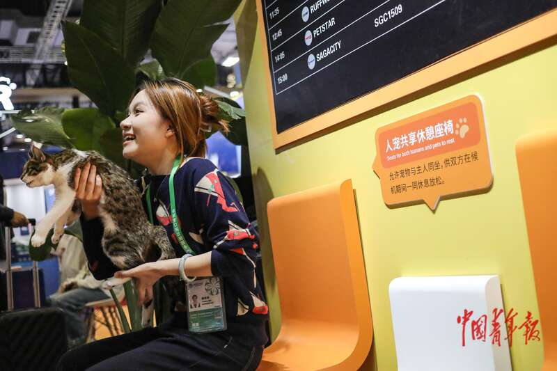 11月8日,上海国家会展中心,第八届中国国际进口博览会消费品展区,一名年轻人在人宠共享休闲座椅上与小猫互动。中青报·中青网记者 孔斯琪/摄