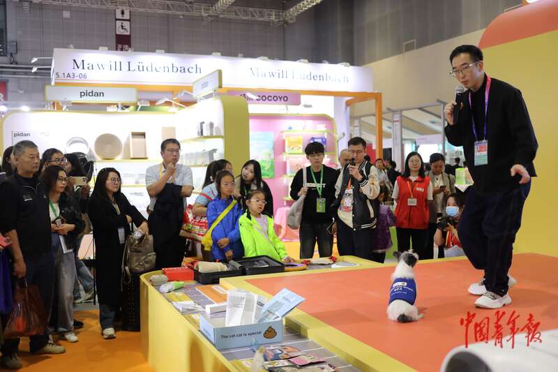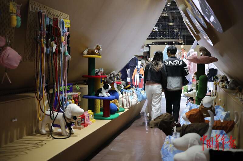 11月8日,上海国家会展中心,第八届中国国际进口博览会消费品展区,几名年轻人在一家买手店展位的宠物用品展区参观。中青报·中青网记者 孔斯琪/摄