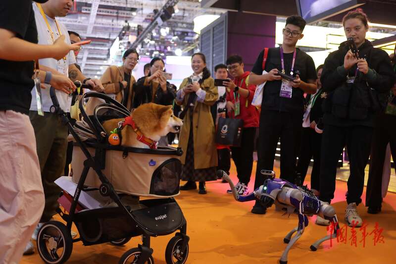 11月8日,上海国家会展中心,第八届中国国际进口博览会技术设备展区,一只机器狗向一只“真狗”打招呼,引来许多人围观。中青报·中青网记者 孔斯琪/摄