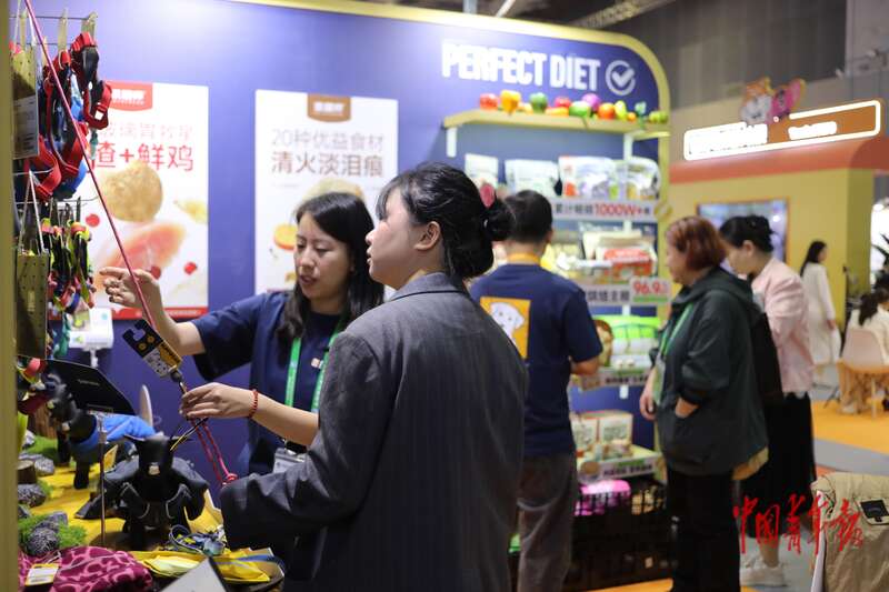 11月8日,上海国家会展中心,第八届中国国际进口博览会消费品展区,一名参观者正在咨询一款狗绳。中青报·中青网记者 孔斯琪/摄