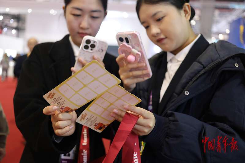 11月8日,上海国家会展中心,第八届中国国际进口博览会消费品展区,两名进博会志愿者在“它博萌爪航站楼”宠物主题展区领取萌宠“登机牌”。中青报·中青网记者 孔斯琪/摄