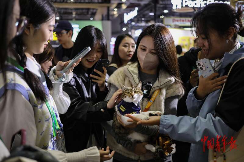 11月8日,上海国家会展中心,第八届中国国际进口博览会消费品展区“它博萌爪航站楼”宠物主题展区,一只网红小猫吸引了许多观众围观互动。今年,进博会首次设立宠物主题展区,汇聚了全球范围内16家在中国市场广受欢迎的国际知名品牌和国内宠物品牌新生代力量。展品范围涵盖宠物食品、保健品、智能设备、服饰出行、环保猫砂、健康护理和人宠共用等品类。现场还举办了网红宠物粉丝见面会,宠物相关知识讲座等活动,吸引了不少参观者的关注。中青报·中青网记者 孔斯琪/摄