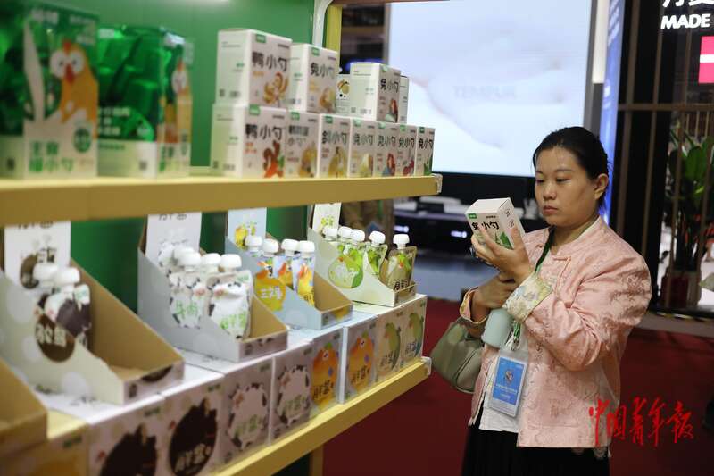 11月8日,上海国家会展中心,第八届中国国际进口博览会消费品展区,一名参展商在查看一款兔食产品。她的公司主营宠物除臭相关产品,正在考虑扩大品类,拓宽市场。中青报·中青网记者 孔斯琪/摄