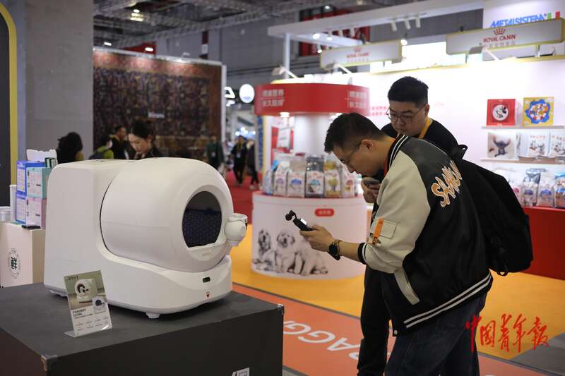 11月7日,上海国家会展中心,第八届中国国际进口博览会消费品展区,两名参观者在拍摄一款智能猫厕所。中青报·中青网记者 孔斯琪/摄