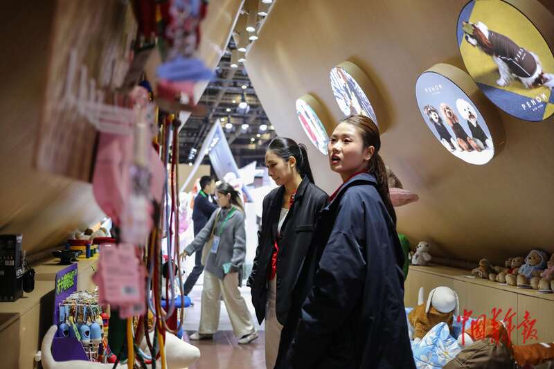 11月8日,上海国家会展中心,第八届中国国际进口博览会消费品展区,两名年轻人在一家买手店展位的宠物用品展区参观。中青报·中青网记者 孔斯琪/摄