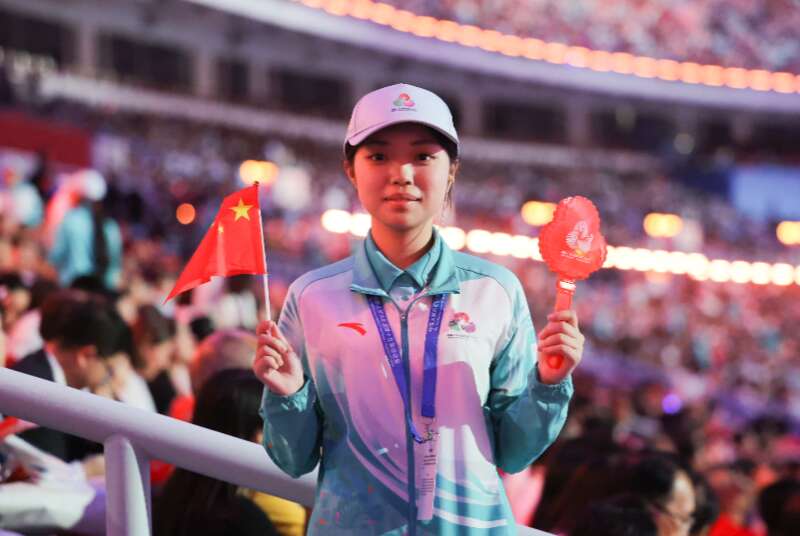 赛会志愿者身穿十五运会官方配发的服装。王俊供图