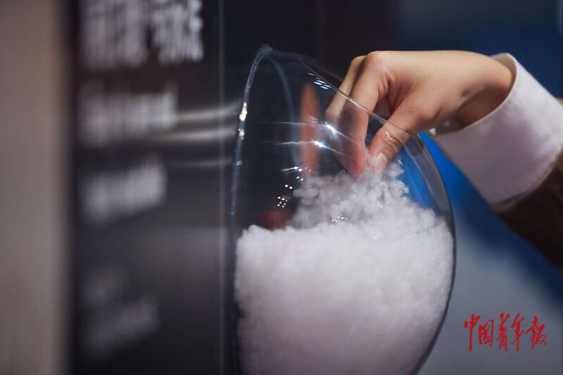 11月8日,上海国家会展中心,第八届中国国际进口博览会消费品展区,一名参观者在优衣库展位触摸一款填充于棉服内部的科技纤维。中青报·中青网记者 孔斯琪/摄