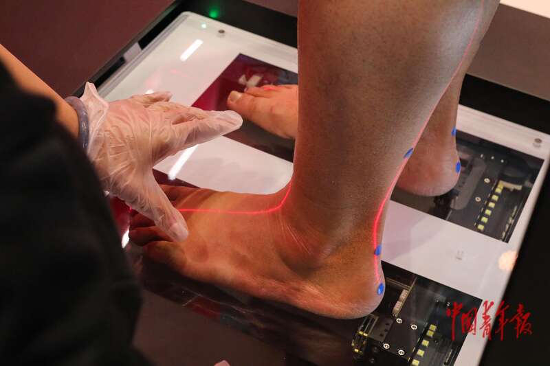 11月8日,上海国家会展中心,第八届中国国际进口博览会消费品展区,一家运动品牌正在为参观者测量足弓健康程度,以为其推荐合适的跑鞋。中青报·中青网记者 孔斯琪/摄