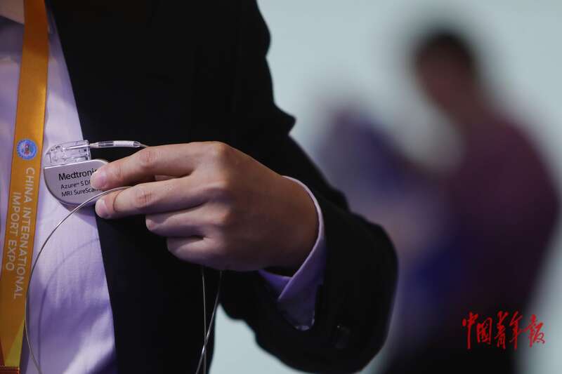 11月10日,上海国家会展中心,第八届中国国际进口博览会医疗器械及医疗保障展区,一名参展商在为来宾介绍一款心脏起搏器。中青报·中青网记者 孔斯琪/摄