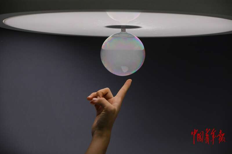 11月10日,上海国家会展中心,第八届中国国际进口博览会消费品展区,一名参观者在与香水泡泡装置互动。该装置将不同品牌的香水“吹”成泡泡,让参观者收获别样的试香体验。中青报·中青网记者 孔斯琪/摄
