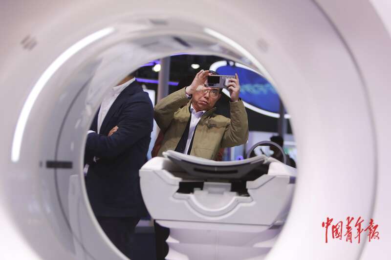 11月10日,上海国家会展中心,第八届中国国际进口博览会医疗器械及医疗保障展区,一名参观者在拍摄一款智能医疗设备。中青报·中青网记者 孔斯琪/摄
