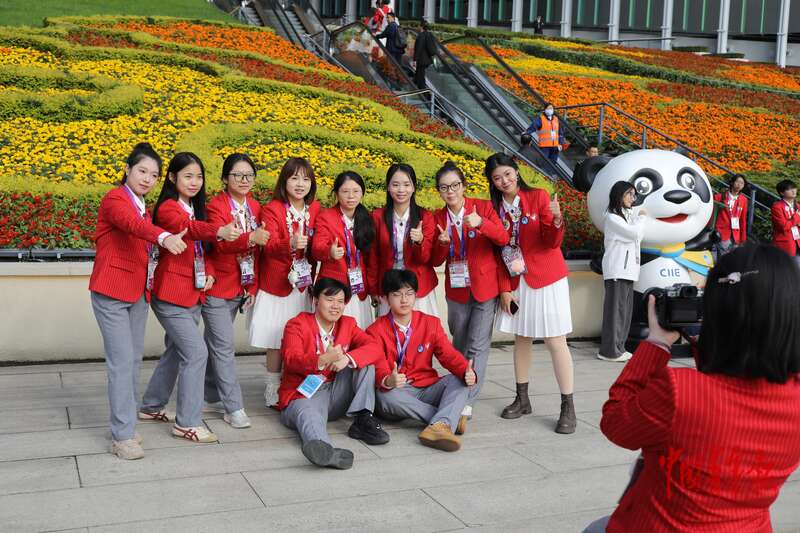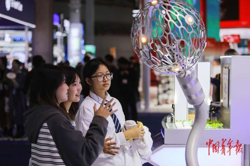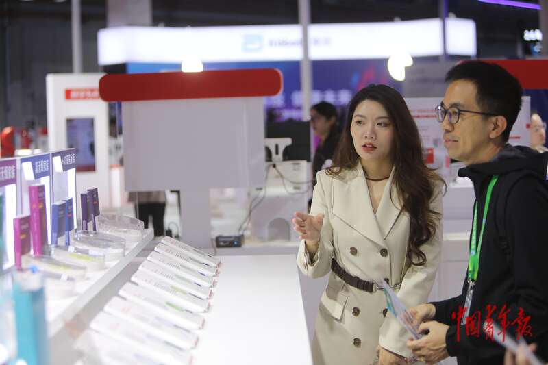 11月10日,上海国家会展中心,第八届中国国际进口博览会医疗器械及医疗保障展区,几名来自上海健康医学院的大学生在观看一款脉冲射频双能量及高精密度标测三合一全功能导管的模型,这是该产品在中国首展。中青报·中青网记者 孔斯琪/摄