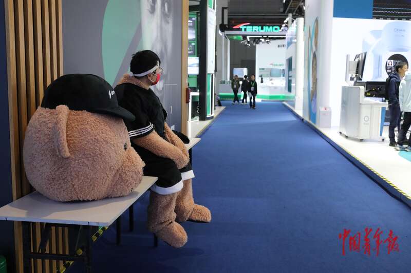 11月10日,上海国家会展中心,第八届中国国际进口博览会医疗器械及医疗保障展区,一名工作人员脱下玩偶装在会场一角休息。中青报·中青网记者 孔斯琪/摄