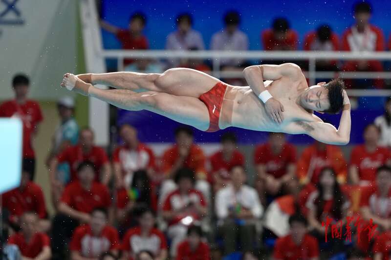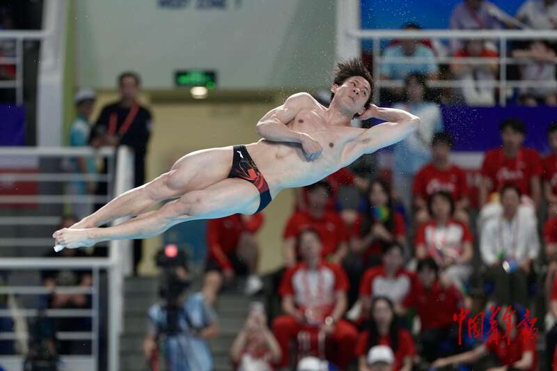 11月10日,广东广州,第十五届全运会男子3米跳板决赛,湖北队选手王宗源在比赛中。当日,湖北队王宗源、郑九源,广东队何超等跳水名将亮相第十五届全运会跳水项目男子3米跳板决赛。最终,王宗源以549.85分的总成绩夺得金牌,郑九源以510.60分获得银牌,何超以489.70分获得铜牌。中青报·中青网记者 李隽辉/摄