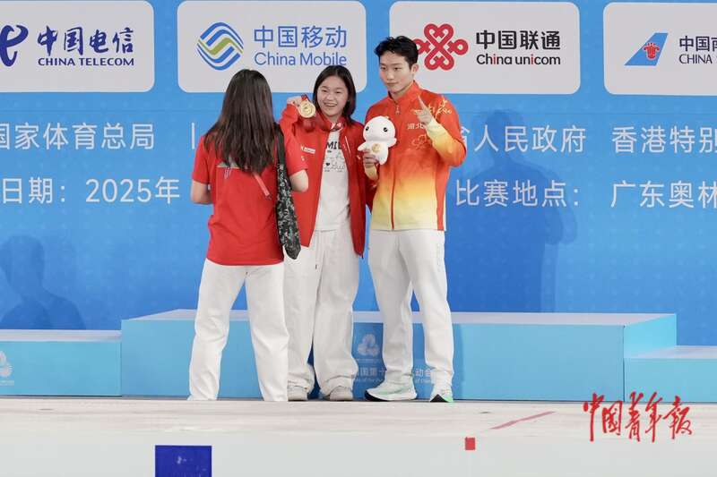 11月10日,广东广州,第十五届全运会男子3米跳板决赛,颁奖仪式后,全红婵(中)与王宗源(右)合影。中青报·中青网记者 李隽辉/摄