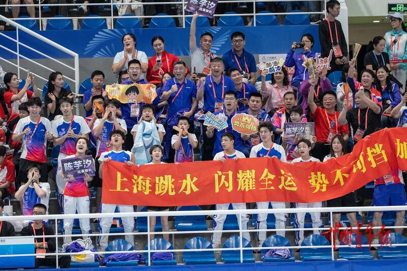 11月10日,广东广州,第十五届全国运动会女子单人10米跳台决赛,支持陈芋汐的观众们。中青报·中青网记者 李隽辉/摄