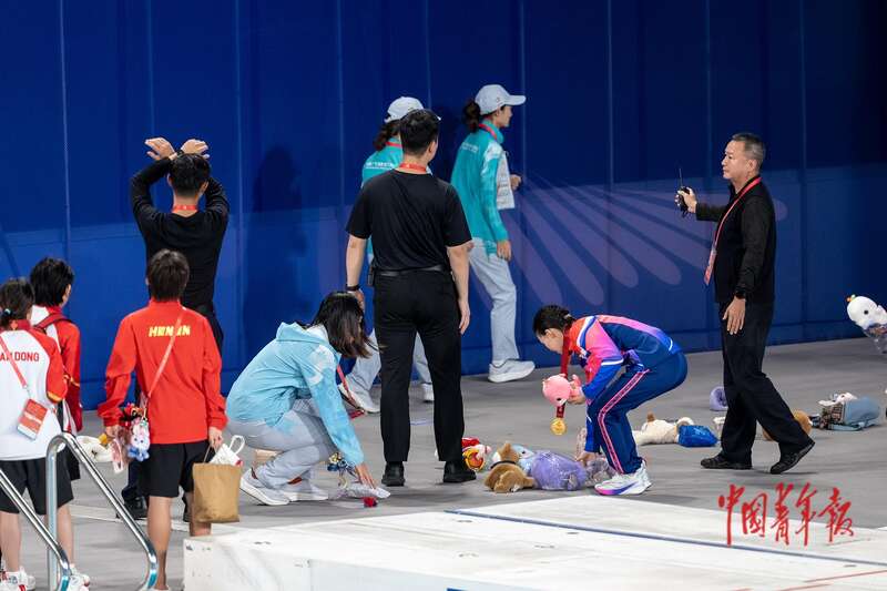 11月10日,广东广州,第十五届全国运动会女子单人10米跳台决赛结束后,观众将玩偶扔下赛场。中青报·中青网记者 李隽辉/摄