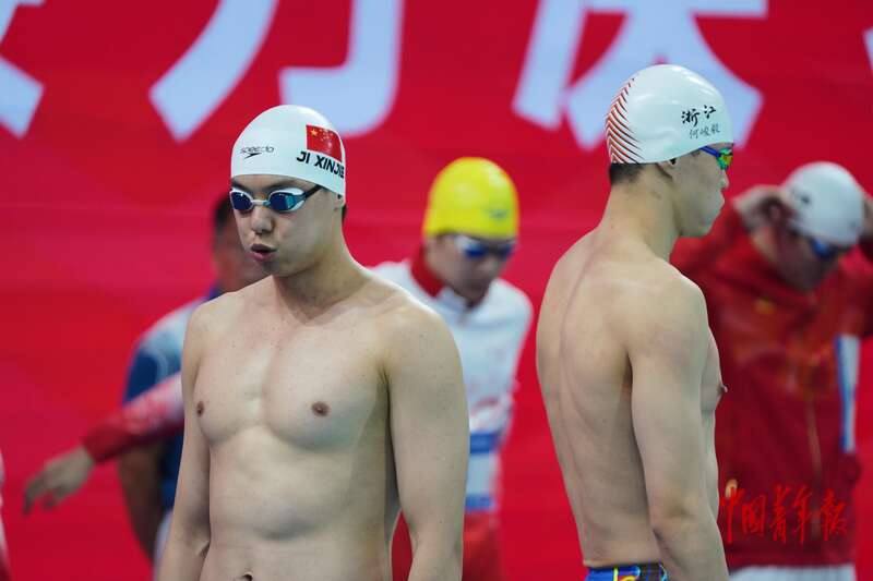 11月10日,广东深圳,大运中心游泳馆,第十五届全运会男子4×100米自由泳接力决赛前,山东队季新杰(左)与浙江队何峻毅背对背深呼吸。中青报·中青网记者 田嘉硕/摄