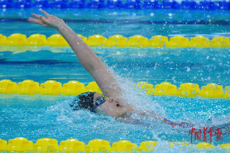 11月10日,广东深圳,大运中心游泳馆,第十五届全运会200米混合泳半决赛,13岁的河北队于子迪以2:11.88的成绩排名第一,晋级决赛。中青报·中青网记者 田嘉硕/摄