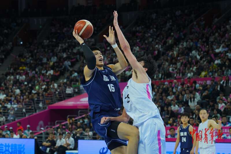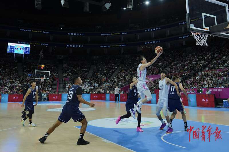 11月12日,广东东莞,东莞篮球中心,十五运会篮球男子成年组决赛,广东队焦泊乔(左)抛投上篮。中青报·中青网记者 田嘉硕/摄