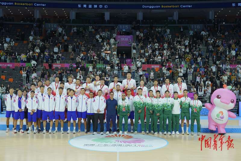 11月12日,广东东莞,东莞篮球中心,十五运会篮球男子成年组颁奖仪式后,冠军广东队与香港队、澳门队合影留念。中青报·中青网记者 田嘉硕/摄
