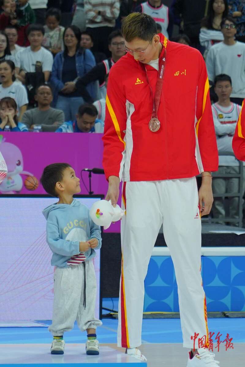11月12日,广东东莞,东莞篮球中心,十五运会篮球男子成年组颁奖仪式,四川队周琦将本届全运会吉祥物喜洋洋送给自己孩子。四川队在铜牌赛中,以81:60战胜辽宁队,取得季军。中青报·中青网记者 田嘉硕/摄