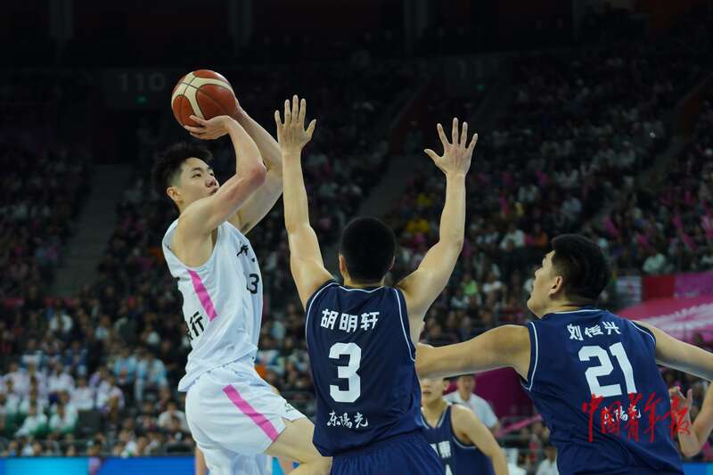 11月12日,广东东莞,东莞篮球中心,十五运会篮球男子成年组决赛,浙江队朱俊龙(左)翻身跳投。中青报·中青网记者 田嘉硕/摄