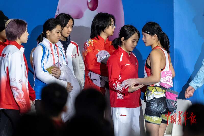 11月13日,广东广州,第十五届全国运动会攀岩项目女子难度决赛结束后,选手们在候场区。中青报·中青网记者 李隽辉/摄