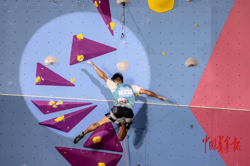 11月13日,广东广州,第十五届全国运动会攀岩项目难度决赛,贵州队选手罗金涛在比赛中。中青报·中青网记者 李隽辉/摄