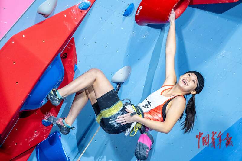 11月13日,广东广州,第十五届全国运动会攀岩项目女子难度决赛,广东队选手李美妮在比赛中展露笑容。中青报·中青网记者 李隽辉/摄