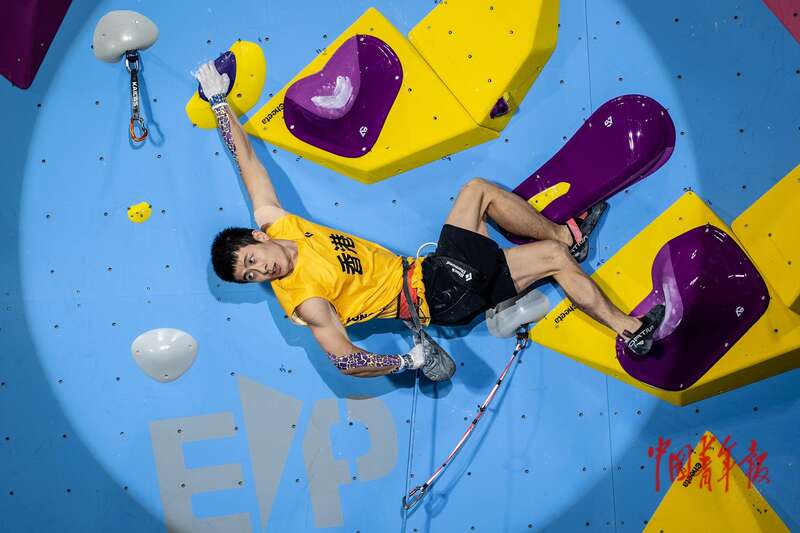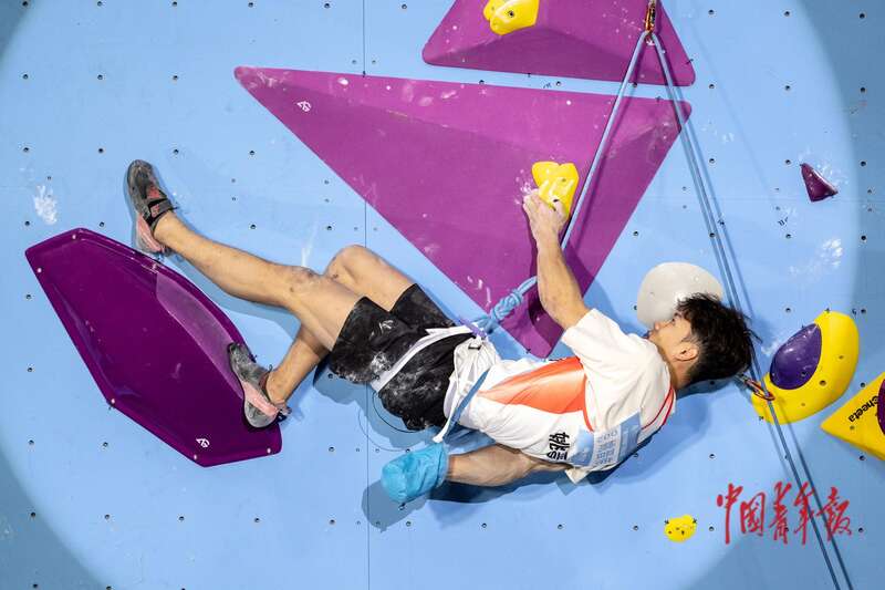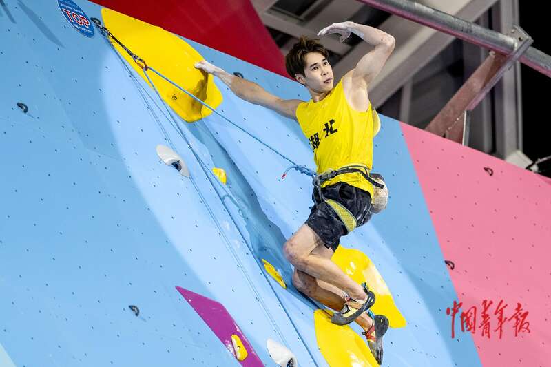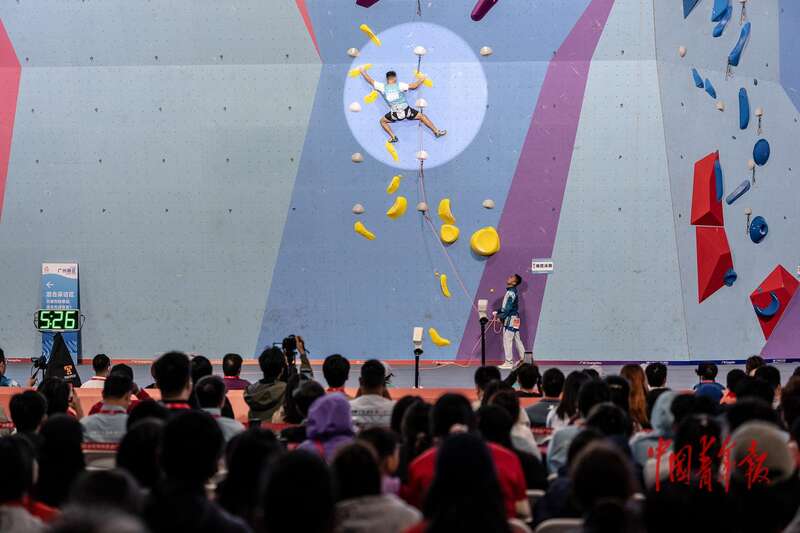 11月13日,广东广州,第十五届全国运动会攀岩项目男子难度决赛,广东队选手姚晋伟在比赛中。中青报·中青网记者 李隽辉/摄