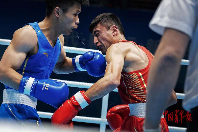 11月14日,广东深圳,宝安体育中心体育馆,十五运会拳击男子60-63.5公斤级决赛,广东队朱健豪(左)与新疆队伊卜拉伊木·马木提在比赛中展开对攻,最终朱健豪摘得该项目桂冠。中青报·中青网记者 田嘉硕/摄