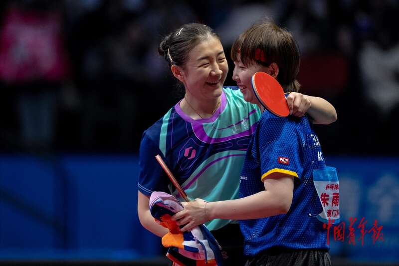 11月16日,澳门,第十五届全国运动会乒乓球女子单打铜牌赛结束后,陈梦(左)和朱雨玲拥抱。中青报·中青网记者 李隽辉/摄