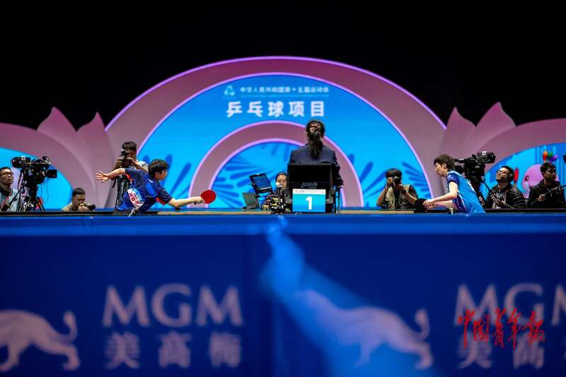 11月16日,澳门,第十五届全国运动会乒乓球女子单打决赛,河北队选手孙颖莎在比赛中。中青报·中青网记者 李隽辉/摄