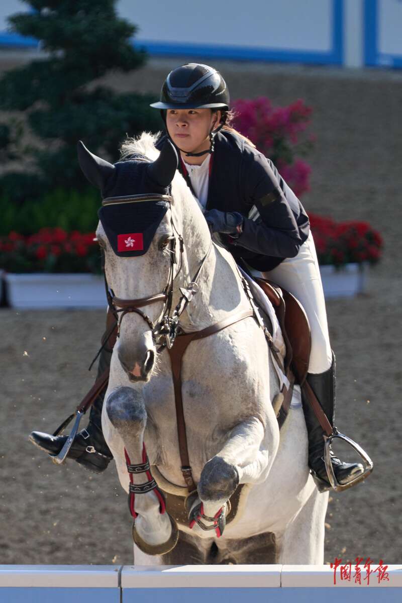 11月17日,广东深圳,光明国际马术中心,十五运会马术场地障碍项目团体赛,香港队沈憶淇与赛马“嵐光”在比赛中。中青报·中青网记者 田嘉硕/摄