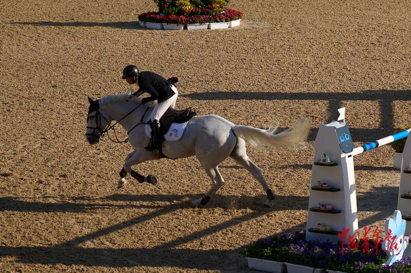 11月17日,广东深圳,光明国际马术中心,十五运会马术场地障碍项目团体赛,北京队周睿弘与赛马“金金”在比赛中。中青报·中青网记者 田嘉硕/摄