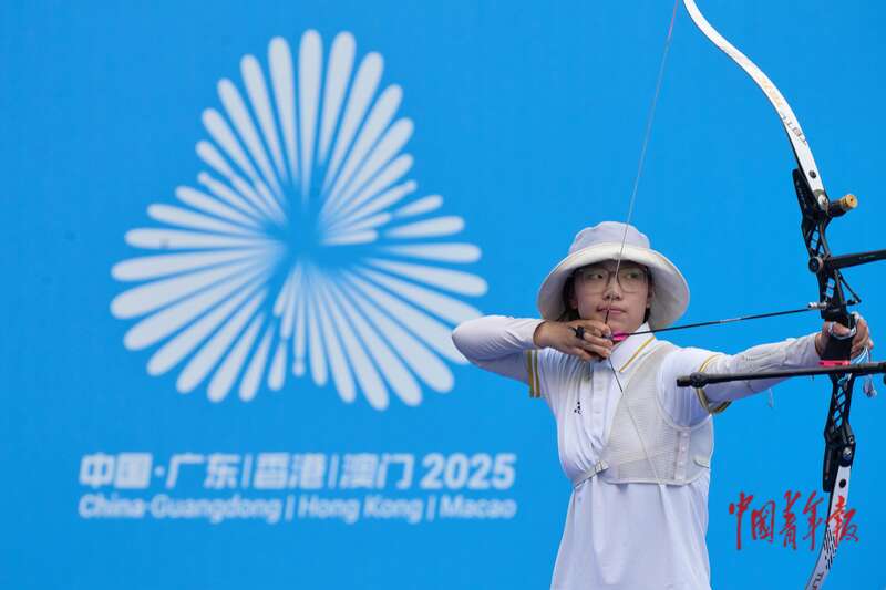 11月16日,广东深圳,深圳体育中心体育场,十五运会射箭女子反曲弓个人决赛金牌决赛,江苏队选手黄雨薇在比赛中。中青报·中青网记者 田嘉硕/摄