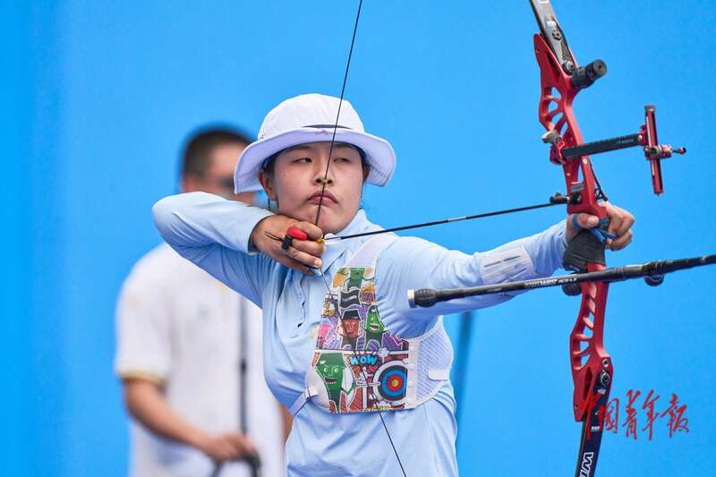 11月16日,广东深圳,深圳体育中心体育场,十五运会射箭女子反曲弓个人决赛铜牌决赛,上海队朱静怡在比赛中出现失误后惊讶万分。中青报·中青网记者 田嘉硕/摄