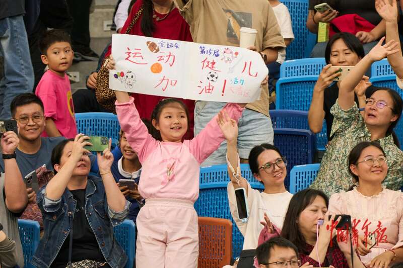 11月16日,广东深圳,深圳体育中心体育场,十五运会射箭女子反曲弓个人决赛金牌决赛,一名小观众高举手绘海报为运动健儿加油。中青报·中青网记者 田嘉硕/摄